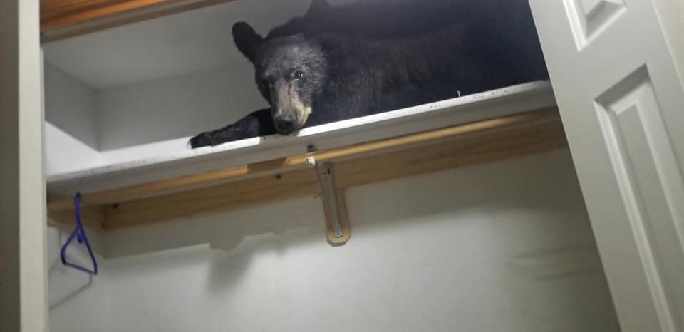 A black bear broke into a house and locked itself into a mudroom and then went to take a nap on the wardrobe shelf.
