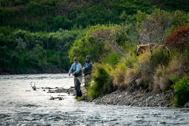 A male bear quietly snuck up on two fishermen trying to catch salmon as they posed for a photo, oblivious of the danger lurking only feet behind them!