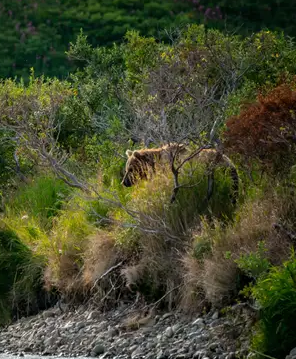 “After the bear had a good look around for salmon, he continued his walk downstream.”
