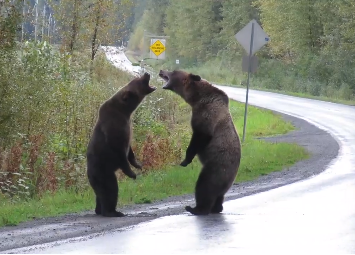 The video started with the bears roaring and growling at each other. It is not clear what made them fight but after a few seconds, the two stood on their hind legs and walked onto the road.