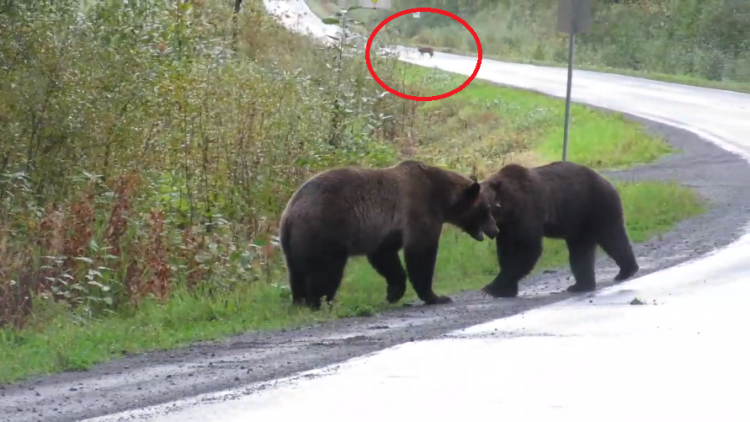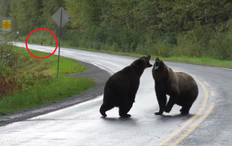 In the background, a small wolf was watching the two bears. The curious animal can be seen standing in the middle of the highway, looking intensely at the fight.