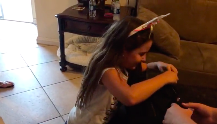 She instantly burst into tears the moment she lifted up the puppy over her lap.
