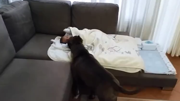 When his father came around and called him while he was keeping an eye on the baby, the dog whose name is Diesel instantly stood up and went to his father, his father then asked to go to the baby and he went, all gentle so he does not harm the baby but affectionate enough to kiss the baby.