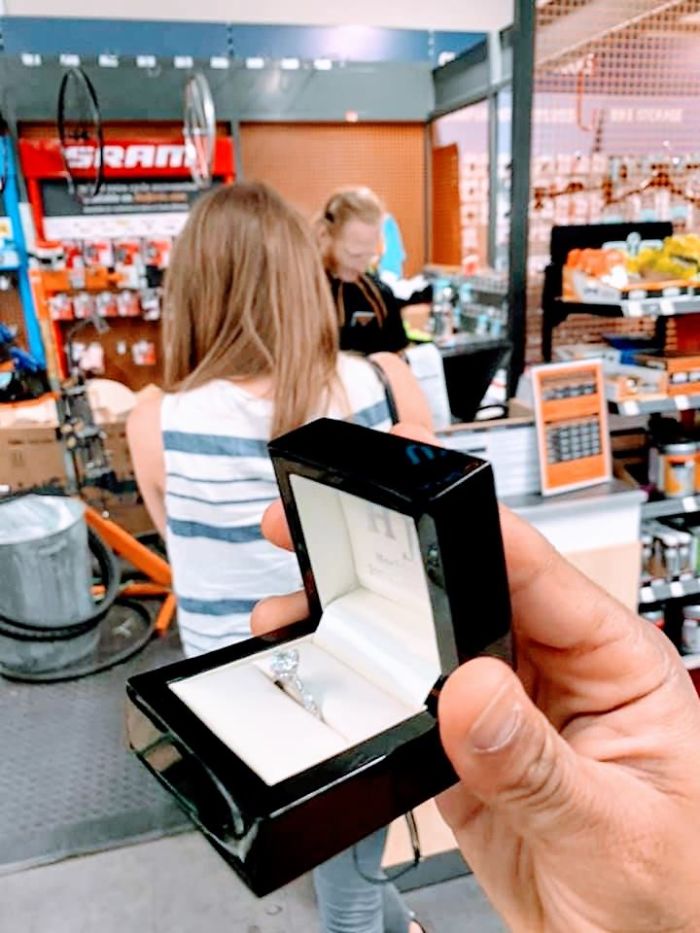 During the entire engagement ring operation, however, there were a few close calls. “The binoculars. Only because she could have just looked up! Also, walking around with it in my pocket I knocked into her a few times [but] she didn’t notice it was a box.”