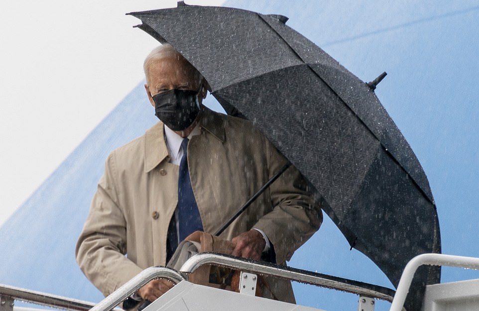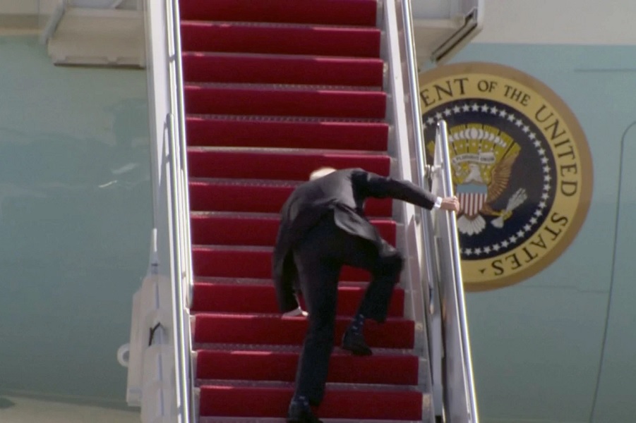 While ascending the stairs of Air Force One during heavy rainfall, the 46th US President nearly fell as he stumbled after missing a step.