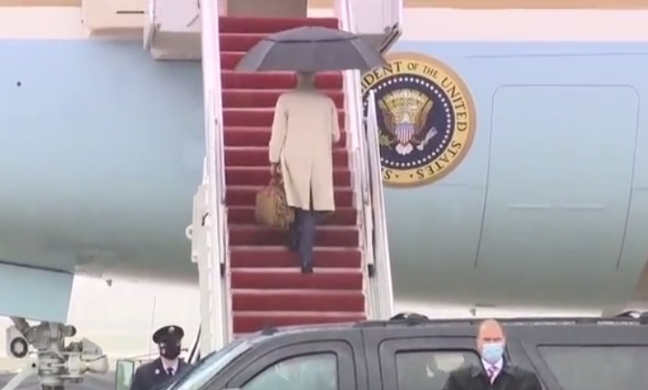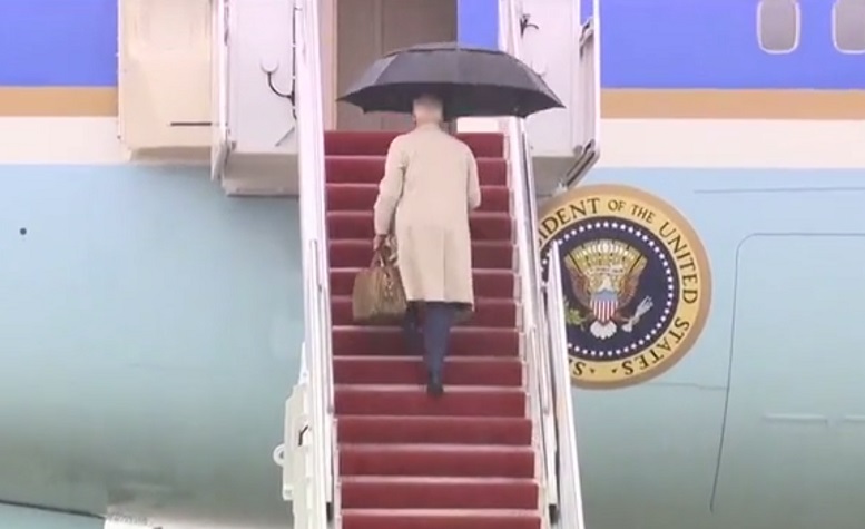 Fortunately, Biden managed to reach the top without a major gaffe despite holding a suitcase in one hand and an umbrella in the other.