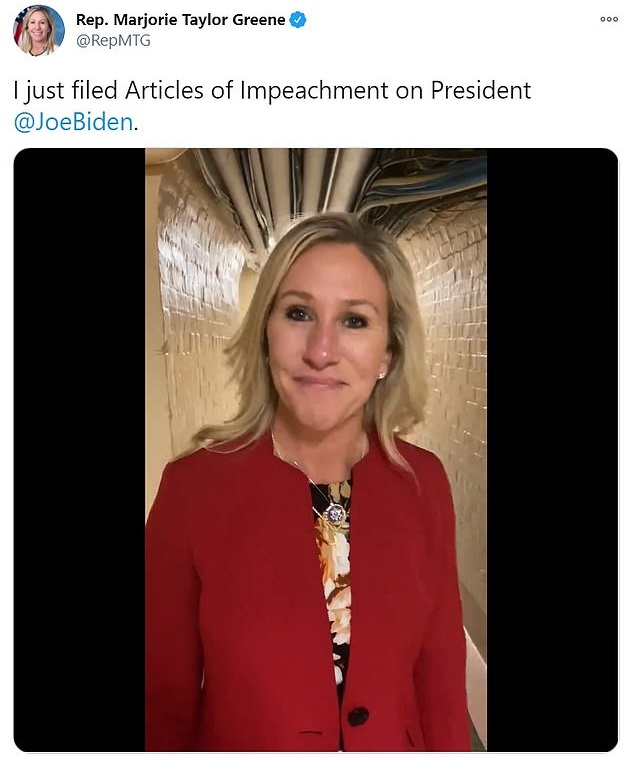 By filing articles of impeachment against President Biden, Greene appeared to have followed through on the promise she had made back on January 13.