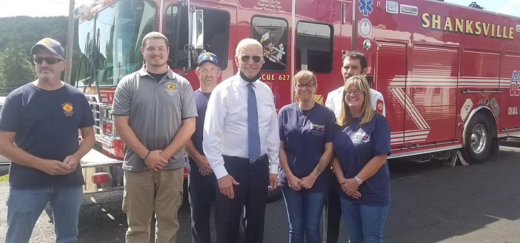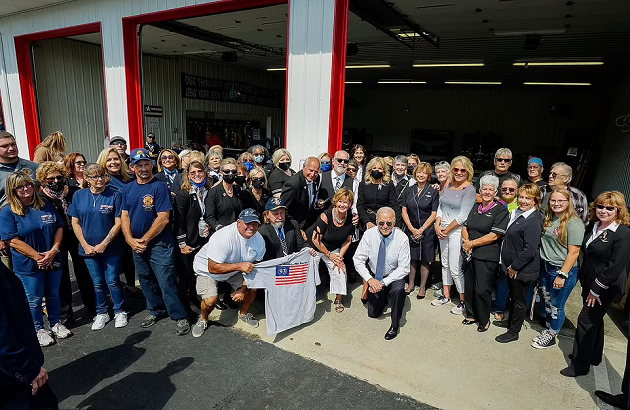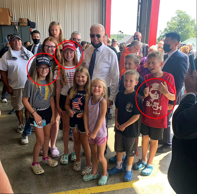 President Joe Biden posed for a photo with a group of kids wearing Trump hats and t-shirt during the 9/11 memorial in Shanksville, Pennsylvania.