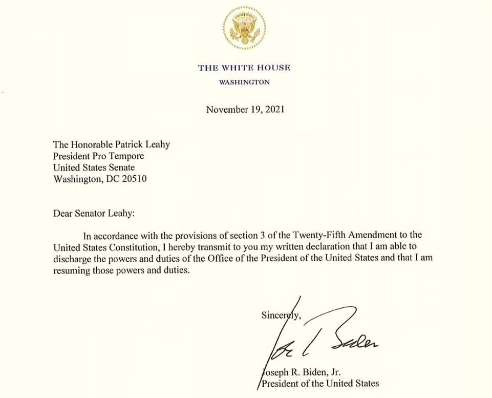Following his colonoscopy, Biden resumed his duties and took back presidential powers by releasing another letter that read: