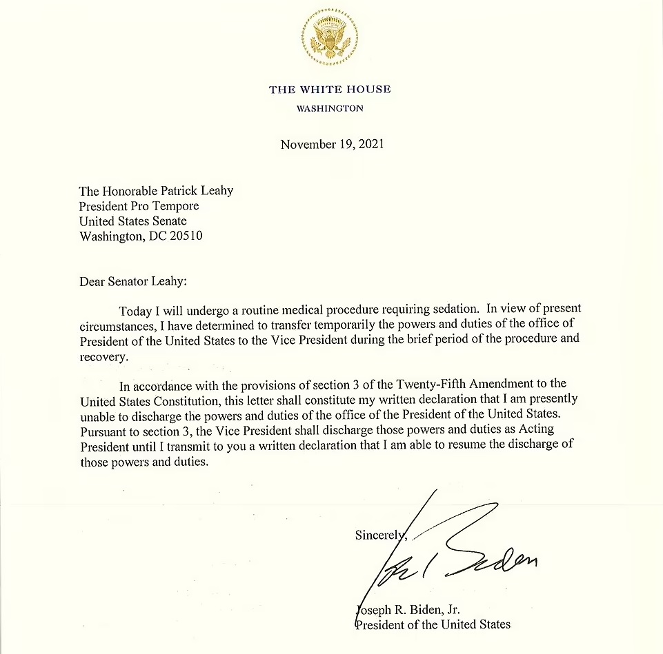 “This letter shall constitute my written declaration that I am presently unable to discharge the powers and duties of the office of the President of the United States,” Biden’s letter to House Speaker Nancy Pelosi and President pro tempore Senator Patrick Leahy read.