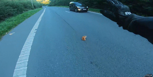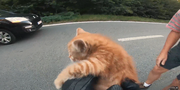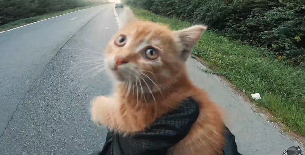 The kitten seemed lost and scared while sitting on the middle of the road, and it is generous of the biker to help the kitten.