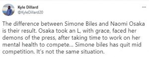 One tweet, from @KyleDillard20, writes, “The difference between Simone Biles and Naomi Osaka is their result. Osaka took an L, with grace, faced her demons of the press, after taking time to work on her mental health to compete… Simone biles has quit mid competition. It’s not the same situation.”