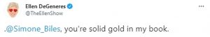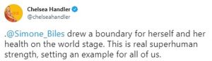 “@Simone_Biles, you’re solid gold in my book” tweeted DeGeneres, while Handler stated: “@Simone_Biles drew a boundary for herself and her health on the on the world stage. This is real superhuman strength, setting an example for all of us.”