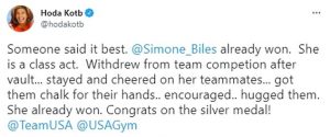Tweeting from Tokyo while covering the Olympic games, Kotb tweeted “Someone said it best. @Simone_Biles already won. She is a class act. Withdrew from team after vault… stayed and cheered on her teammates… got them chalk for their hands.. encouraged.. hugged them. She already won. Congrats on the silver medal!’
