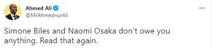 Though another tweet from @MrAhmednurAli simply reads, “Simone Biles and Naomi Osaka don’t owe you anything. Read that again.”