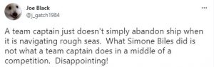 “A team captain just doesn’t simply abandon ship when it is navigating rough seas. What Simone Biles did is not what a team captain does in a middle of a competition. Disapointing!” another tweet stated.