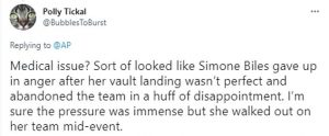 “Medical issue? Sort of looked like Simone Biles gave up in anger after her vault landing wasn’t perfect and abandoned the team in a huff of disappointment. I’m sure the pressure was immense but she walked out on her team mid-event” one tweet stated.