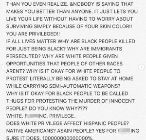 This post is a part in a series of posts where she had angrily shared news and tribulations related to the death and plight of George Floyd. She has also spoken directly against the President of the United States Donald Trump, calling him a part of the origin of the problem of systemic racism in Aemerica.