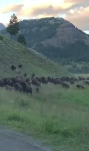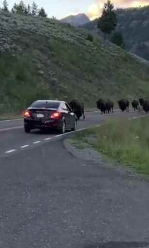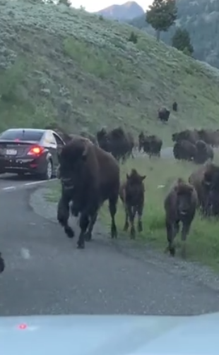 But the show did not last long. Although they had made sure that they kept their car at a safe distance, the group of bison started running and it turned into a bison stampede.