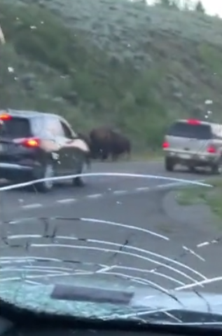 A bison came running and crashed into their car. The windshield of the car broke while they were still inside.