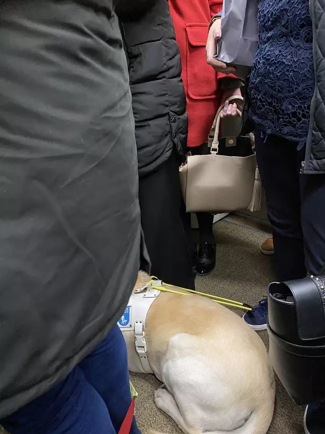 A blind man has spoken out and claimed he was forced to stand on a packed train with his guide dog because no one offered him a seat despite repeatedly asking if there was any space left.