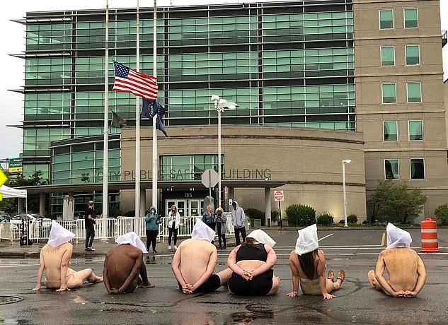 Naked BLM protesters sat in front of Rochester city building while wearing spit hoods following the death of Daniel Prude, who was naked at the time of his fatal arrest.
