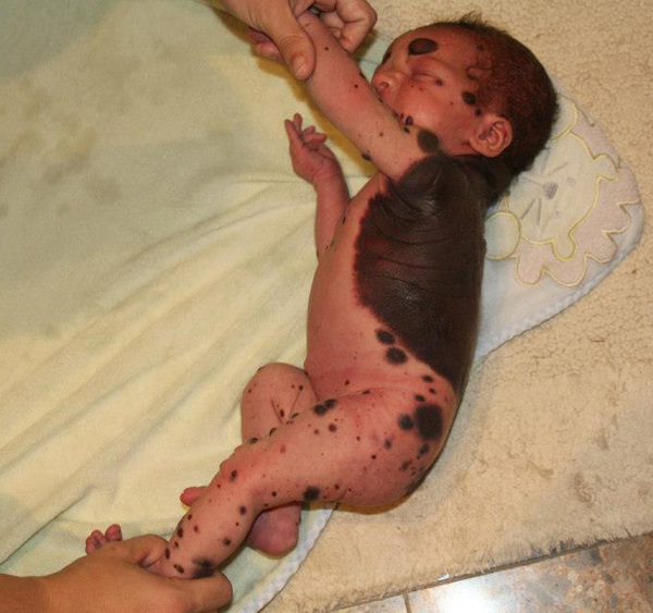 The doctors immediately realized that something wasn’t right with the newborn as the skin on his back was dark red. The rest of the body of Dylan was covered in large black liver spots.