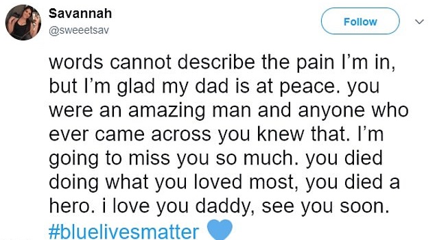 “I’m going to miss you so much. You died doing what you loved most, you died a hero. I love you daddy, see you soon. #bluelivesmatter”