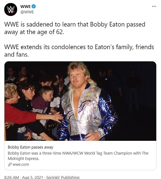 “WWE is saddened to learn that Bobby Eaton passed away at the age of 62. WWE extends its condolences to Eaton’s family, friends and fans,” WWE wrote on Twitter.
