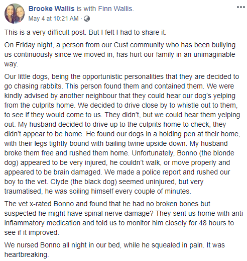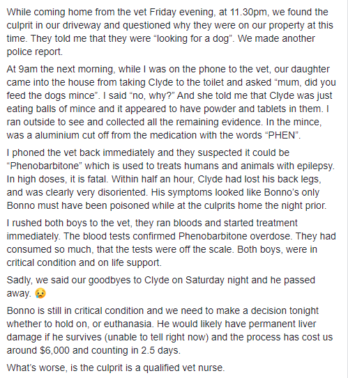 They drove to the property and whistled to Bonno and Clyde but they did not run back to their owners like they usually did. Wallis could hear their pets howling in pain.