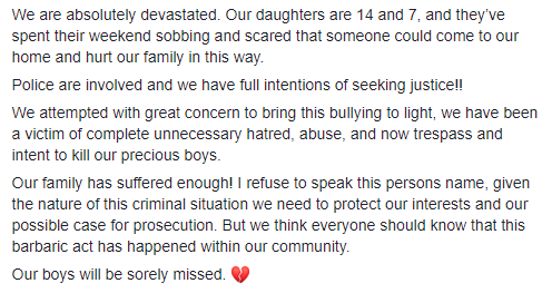 She added: “We are absolutely devastated. Our daughters are 14 and 7, and they’ve spent their weekend sobbing and scared that someone could come to our home and hurt our family in this way.”