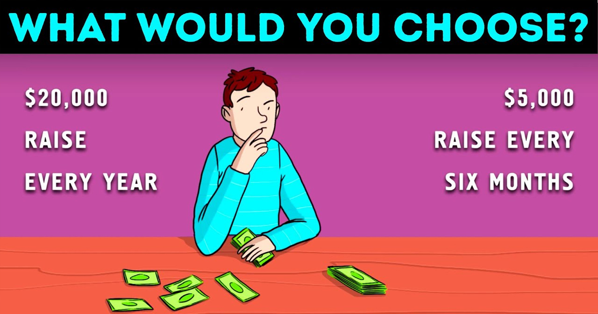 Can you tell us which of the following you would choose and why: A $20,000 raise each year or a $5,000 raise every six months. Let us know in the comments section and before you leave which company’s job you’d choose and why. Also, take a peek at the puzzle’s end to see whether or not your solution matches ours.