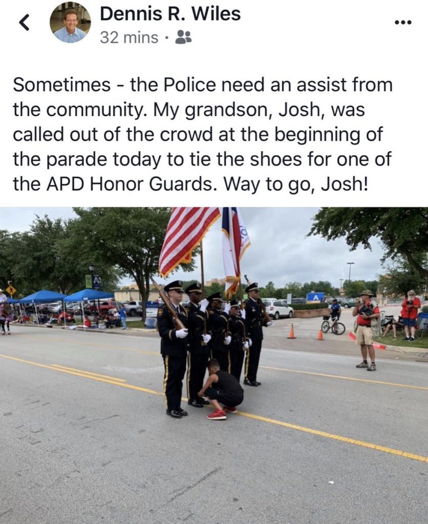 “Sometimes the police need an assist from the community,” Wiles wrote. “My grandson, Josh, was called out of the crowd at the beginning of the parade today to tie the shoes for one of the APD Honor Guards. Way to go, Josh!”