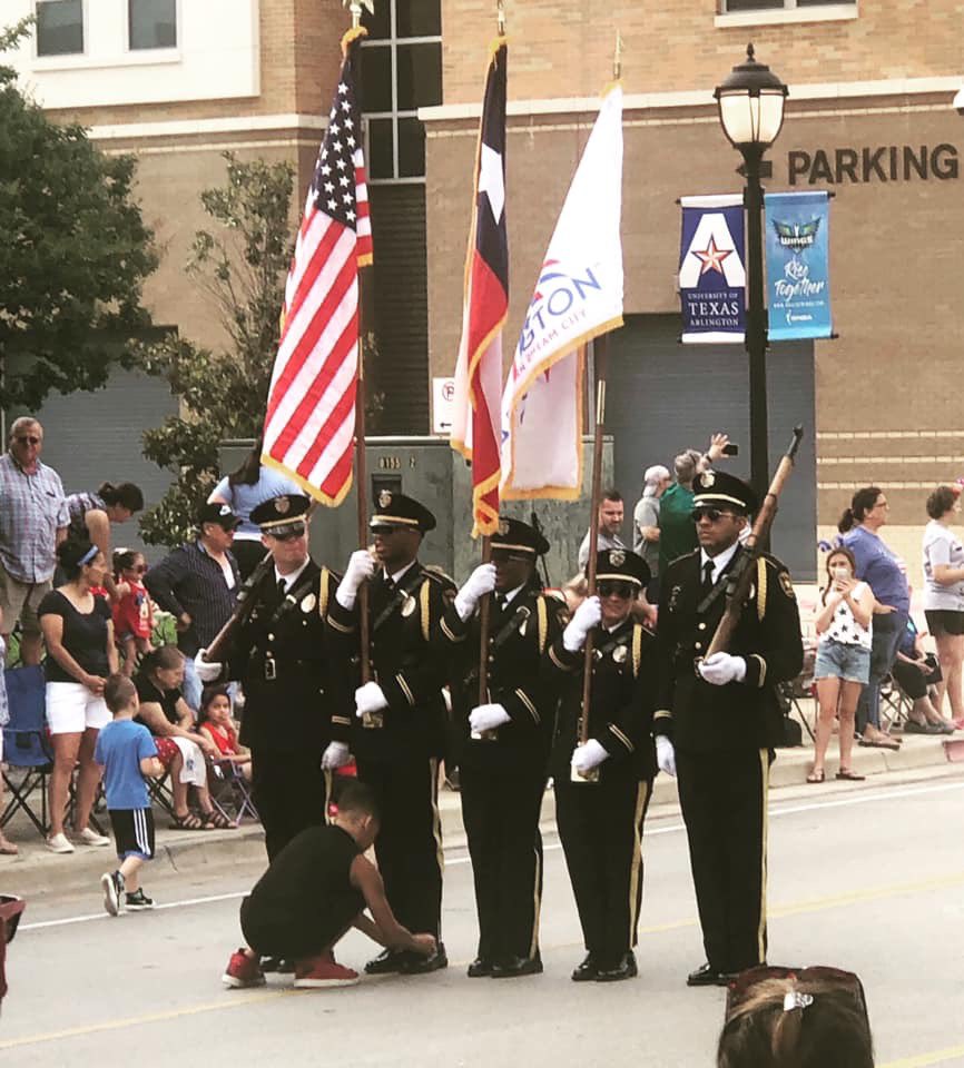 “It eventually became too large for the park path and has evolved into a two-mile, high-spirited, curb-to-curb ribbon of red, white and blue with 150 entries that rolls through downtown and UTA’s College Park District to the beat of patriotic music played by all six Arlington high schools and a variety of other musical entries.’’