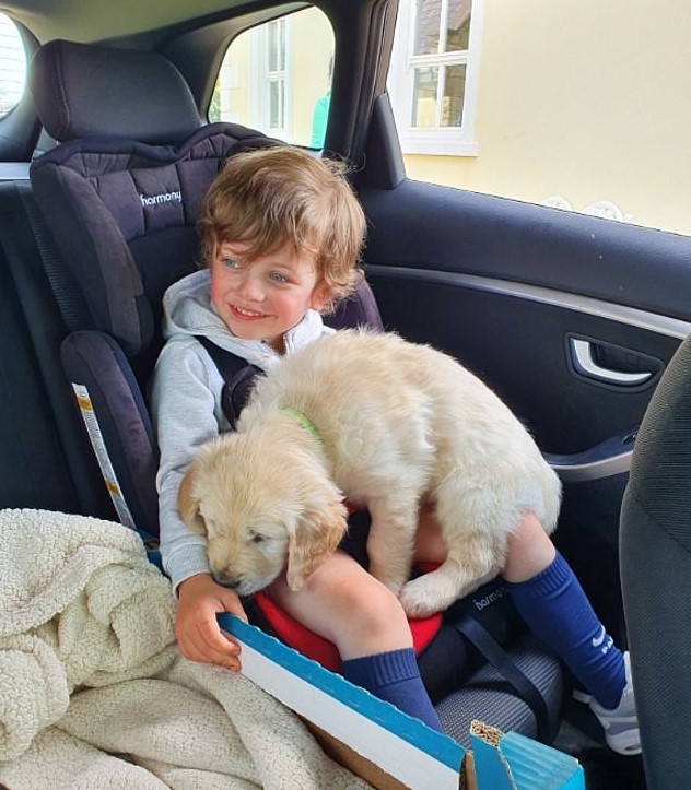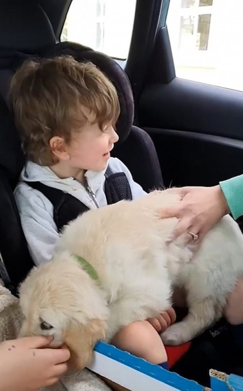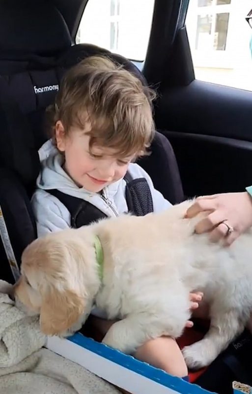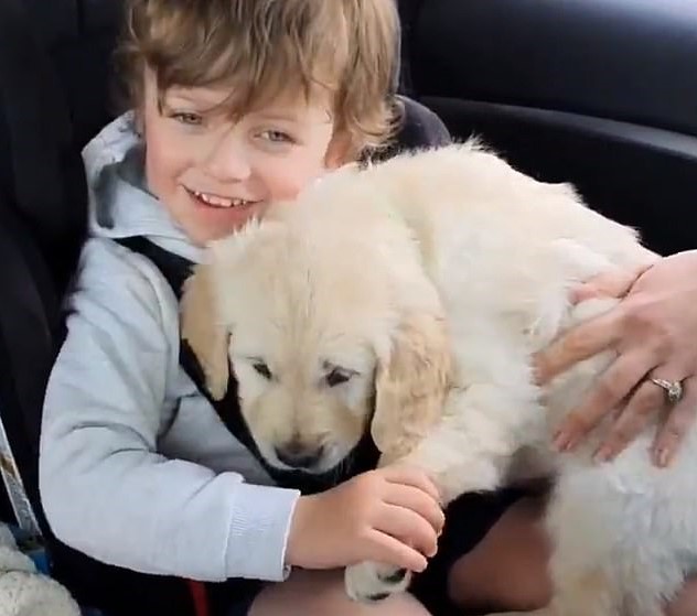 Captured by Carl, the heartwarming video shows the young boy sitting in the family car. His mother then walks by the window holding a Golden Retriever and gave it to him. His face lights up with happiness as the adorable pup Marley was put on his lap.
