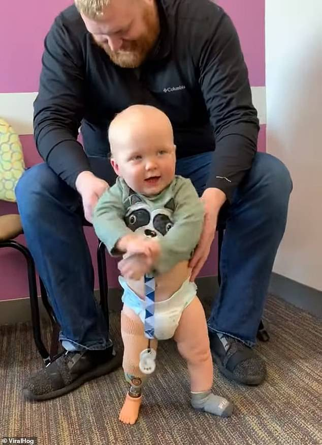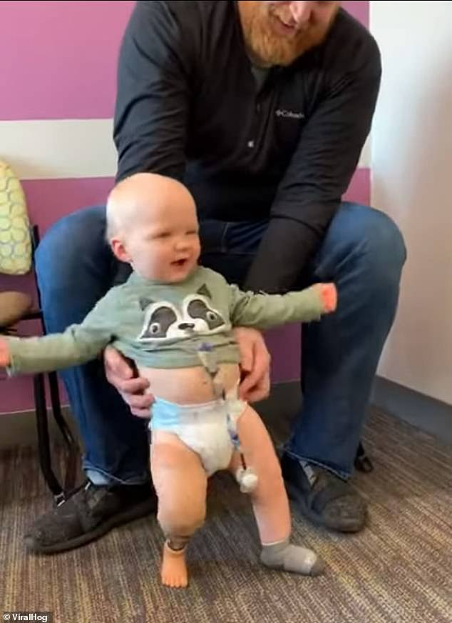 A child who was born with one leg danced in delight when he stood on his feet for the first time.