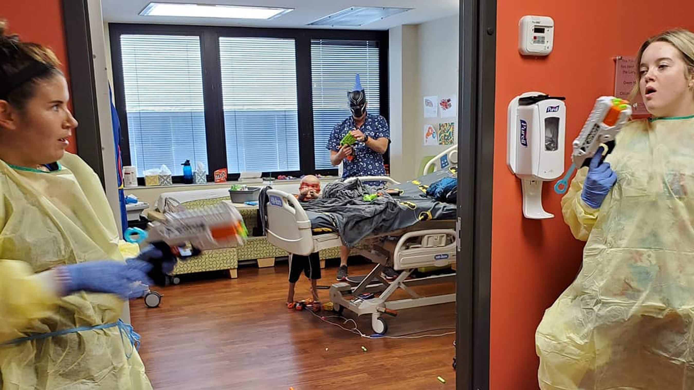 “When he was feeling extra energetic he would want to have a Nerf War with Mommy or Daddy,” Jeremy recalls. “Well, eventually that turned into bringing the nurses in for battles! And as we battled more, we got more guns, different types of guns and costumes, and the nurses would play along!”
