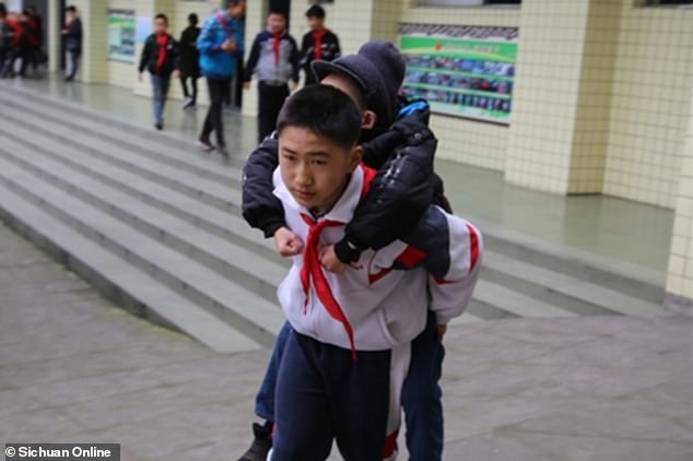 Since then Xu has been carrying Zhang to school. Xu told Chengdu Economic Channel: ‘I am bigger than him. I thought if I didn’t help him, nobody else would.’