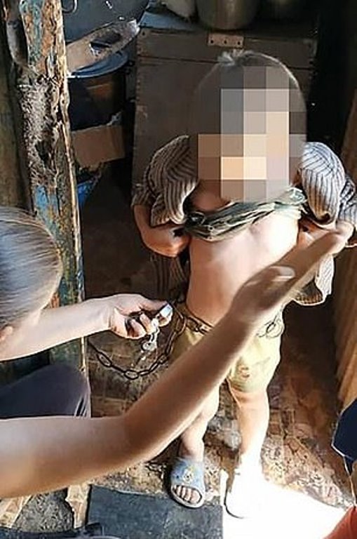 Shocked police found the little boy on his knees tethered to a door. Photos were released showing the metal chain around the boy’s body to keep him in place.