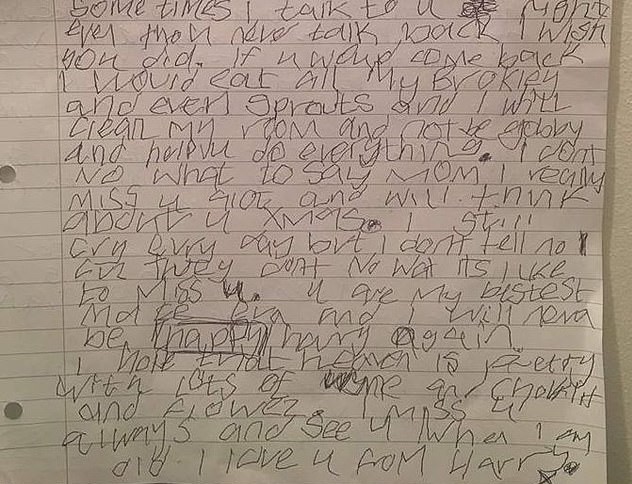 In a devastating letter, Harry from Netherton, England, pleaded with his dead mother to come back to him and promised to eat broccoli and clean his room if she returned.