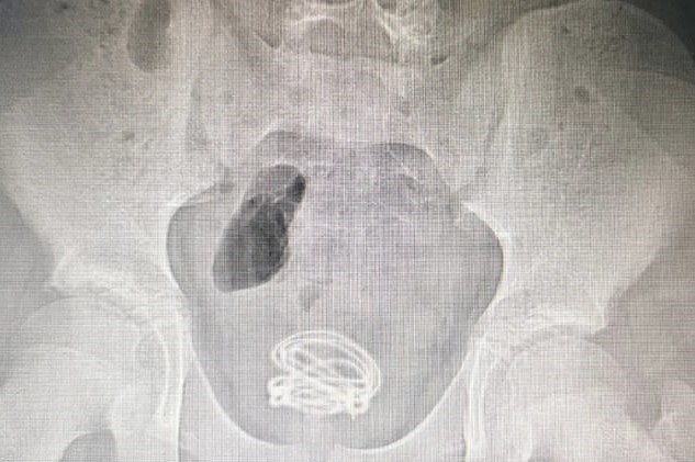 Doctors were shocked to discover the tangled cord inside the boy’s bladder on an X-ray scan.
