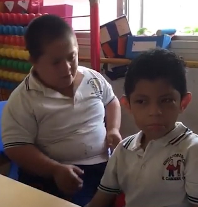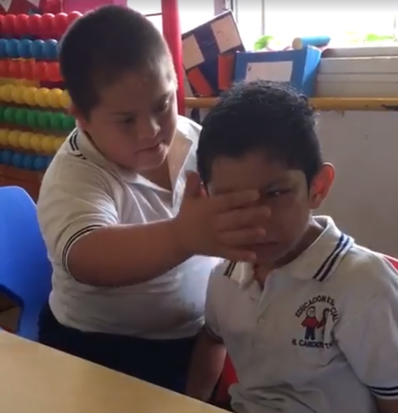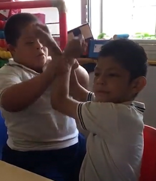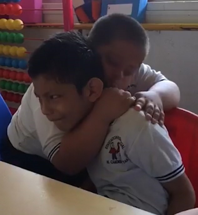 The sweet exchange occurred at a school in Jalisco, Mexico, where the unnamed boy with Down syndrome moved closer to his friend with autism after seeing that he was distressed.