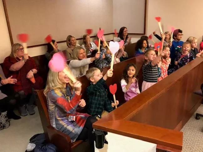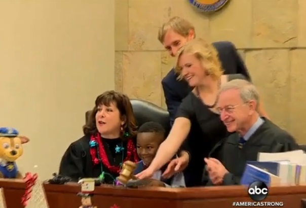 In a series of photos, the five-year-old appeared ecstatic as his classmates waved sticks with hearts on them. The kids were also addressed by Judge Patricia Gardner whom they told the heart-wrenching reason why they appeared in the court.