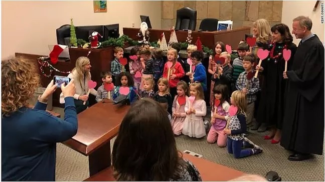 To share his joy with his kindergarten classmates, the boy invited all of them to the Kent County Court on the day he was legally adopted.