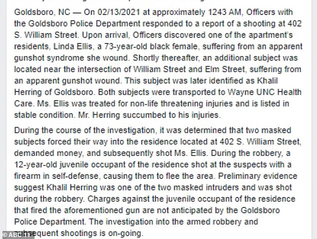 Officials said in a statement: “Preliminary evidence suggest Khalil Herring was one of the two masked intruders and was shot during the robbery.