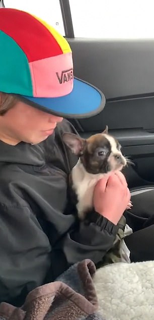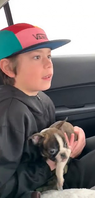 In the video, Logan was in the back seat of a car wearing a baseball cap. His cousin, Jon, then turned around and handed him a Boston Terrier puppy.