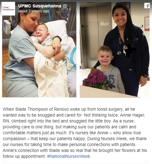 UPMC wrote on Facebook: “As a nurse, providing care is one thing, but making sure our patients are calm and comfortable matters just as much.