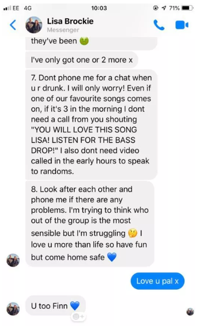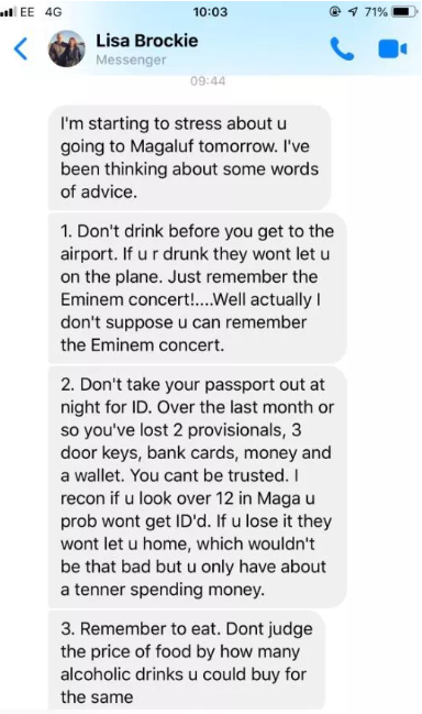 Finlay Brockie went viral when he revealed the broad list of warnings from his mother Lisa that he must follow on his boys’ holiday to the Spanish party resort.
