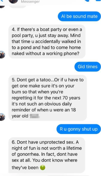 The stern list comprised of things like not getting inked unless the tattoo is on his bum and not having unprotected sex, or sex at all because they did not know where they had been.