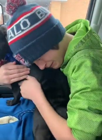 After seeing the pug, young Carter broke into tears before joining her on the front seat and hugging her tightly.